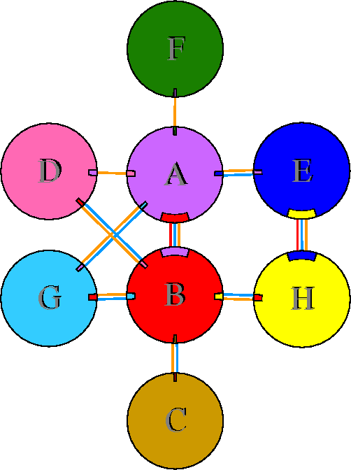 Interacting chains are joined by coloured lines, each representing
