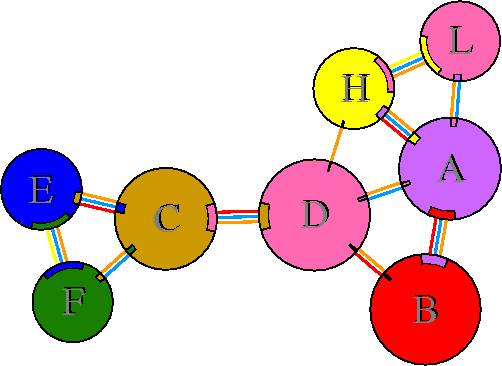 Interacting chains are joined by coloured lines, each representing