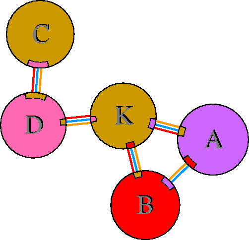 Interacting chains are joined by coloured lines, each representing