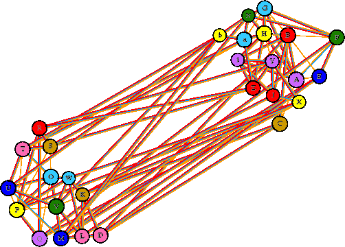 Interacting chains are joined by coloured lines, each representing