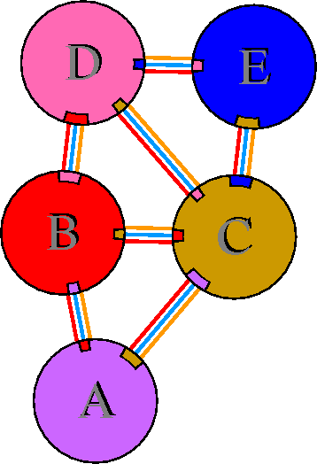 Interacting chains are joined by coloured lines, each representing