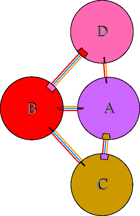 Interacting chains are joined by coloured lines, each representing