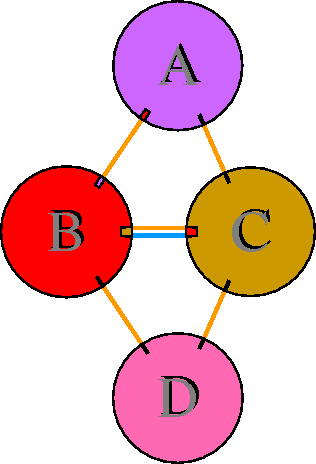 Interacting chains are joined by coloured lines, each representing