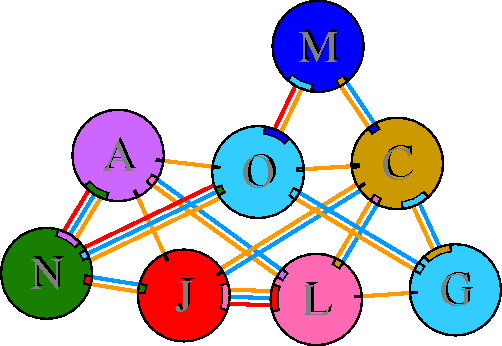 Interacting chains are joined by coloured lines, each representing