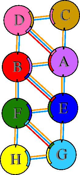Interacting chains are joined by coloured lines, each representing
