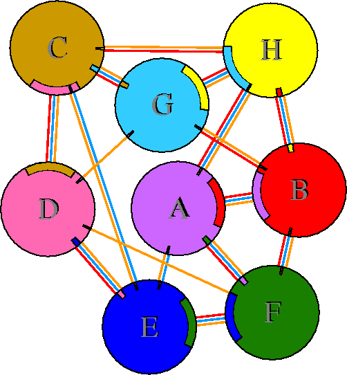 Interacting chains are joined by coloured lines, each representing