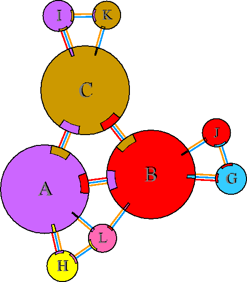 Interacting chains are joined by coloured lines, each representing