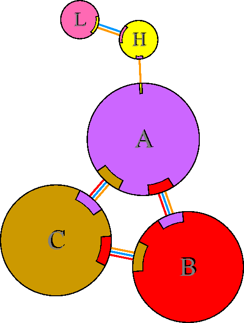 Interacting chains are joined by coloured lines, each representing