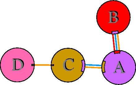 Interacting chains are joined by coloured lines, each representing