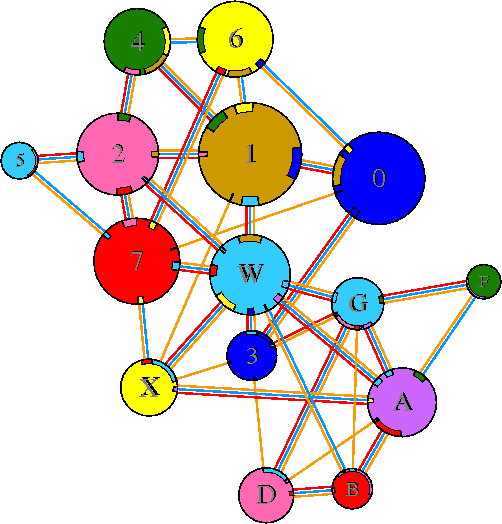 Interacting chains are joined by coloured lines, each representing