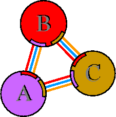 Interacting chains are joined by coloured lines, each representing