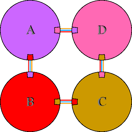 Interacting chains are joined by coloured lines, each representing