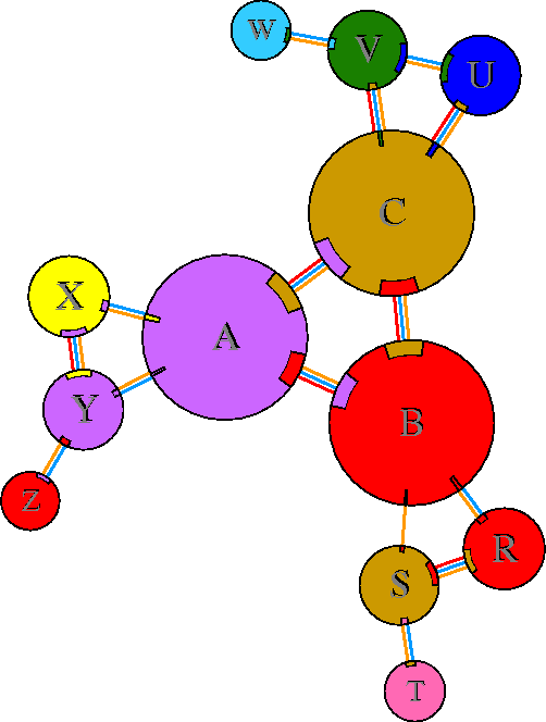 Interacting chains are joined by coloured lines, each representing