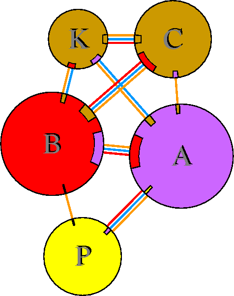 Interacting chains are joined by coloured lines, each representing