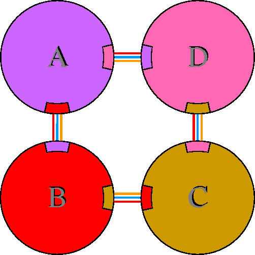 Interacting chains are joined by coloured lines, each representing