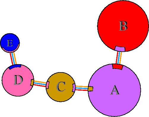 Interacting chains are joined by coloured lines, each representing