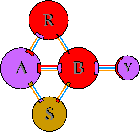 Interacting chains are joined by coloured lines, each representing