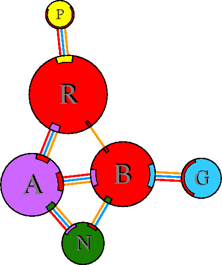 Interacting chains are joined by coloured lines, each representing