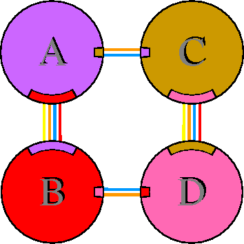Interacting chains are joined by coloured lines, each representing