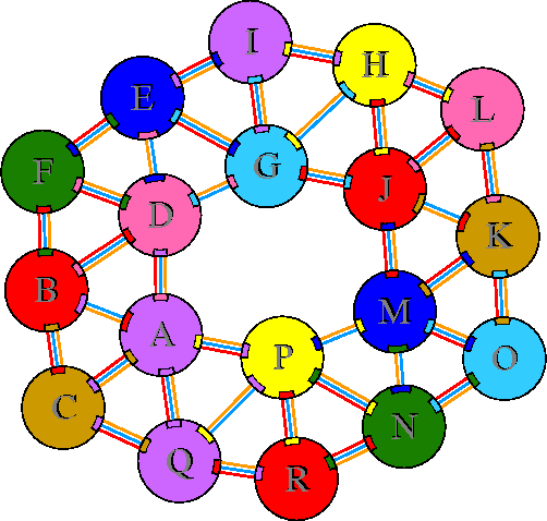 Interacting chains are joined by coloured lines, each representing