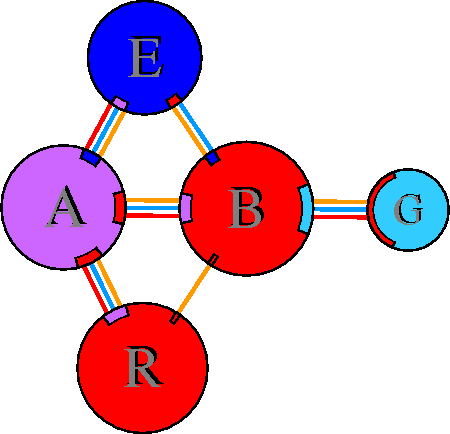 Interacting chains are joined by coloured lines, each representing