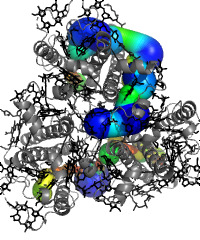 Pores are connected internal spaces going through the structure. Only pores longer than 25 Å are shown. |