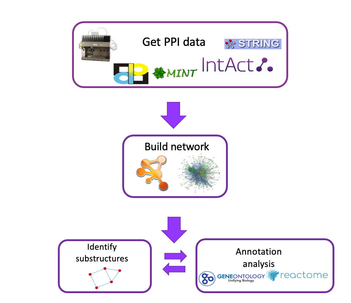 Now that we know a bit about graph theory and protein-protein interaction networks, we can look at the steps, strategies and tools used to build and analyse these networks (Figure 20).
