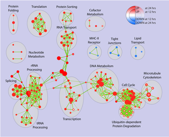 Finally, there are tools that are specifically devoted to simplifying the task of interpreting annotation enrichment results. The Cytoscape EnrichmentMap app (Figure 35) is a very good example. It can use the output from some of the most popular annotation enrichment tools, such as DAVID, BiNGO, g:Profiler or the more sophisticated GSEA, and render it in the shape of clustered networks. The tool applies clustering and automatic layout techniques to overlap similar gene sets and provide a simplified representation of annotation enrichment results. It is especially useful when comparing results obtained from different sets, for example, those representing two different conditions.